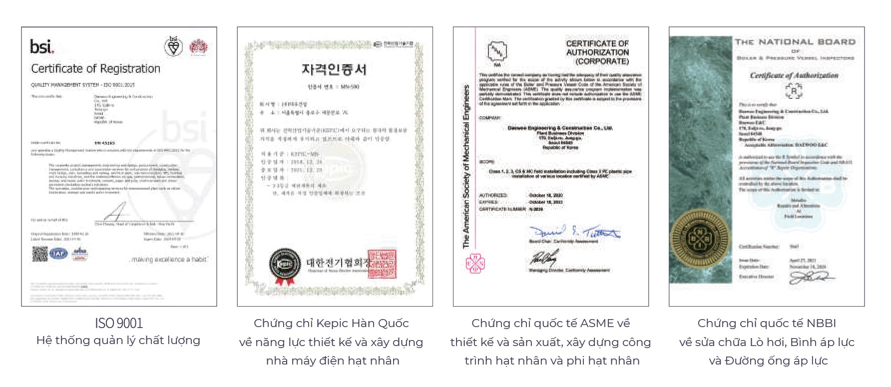 Chúng tôi là công ty xây dựng đầu tiên ở Hàn Quốc đạt được chứng chỉ ISO 9001 và đã duy trì chứng chỉ KSQ và ISO 9001 trong tất cả các lĩnh vực hoạt động của mình. Khả năng của chúng tôi trong lĩnh vực xây dựng và bảo trì các nhà máy điện hạt nhân đã giúp chúng tôi nhận được chứng chỉ từ ASME cho NA, NPT và NS. Chúng tôi cũng tự hào về các chứng chỉ KEPIC MN/EN/SN/MH và NBBI NR.